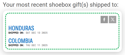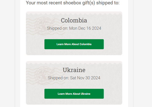 We dropped off a little over 200 boxes at our local collection center. Those boxes went to two locations: Colombia and Ukraine.
